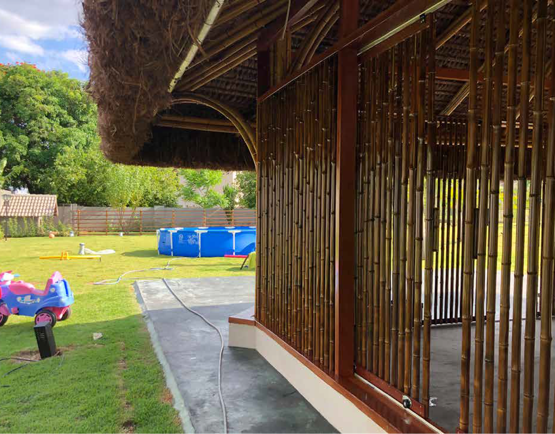 Multipurpose covered space featuring heat-bent curved bamboo columns, designed for yoga, meditation, and therapy practices - BrasĂlia, Brazil