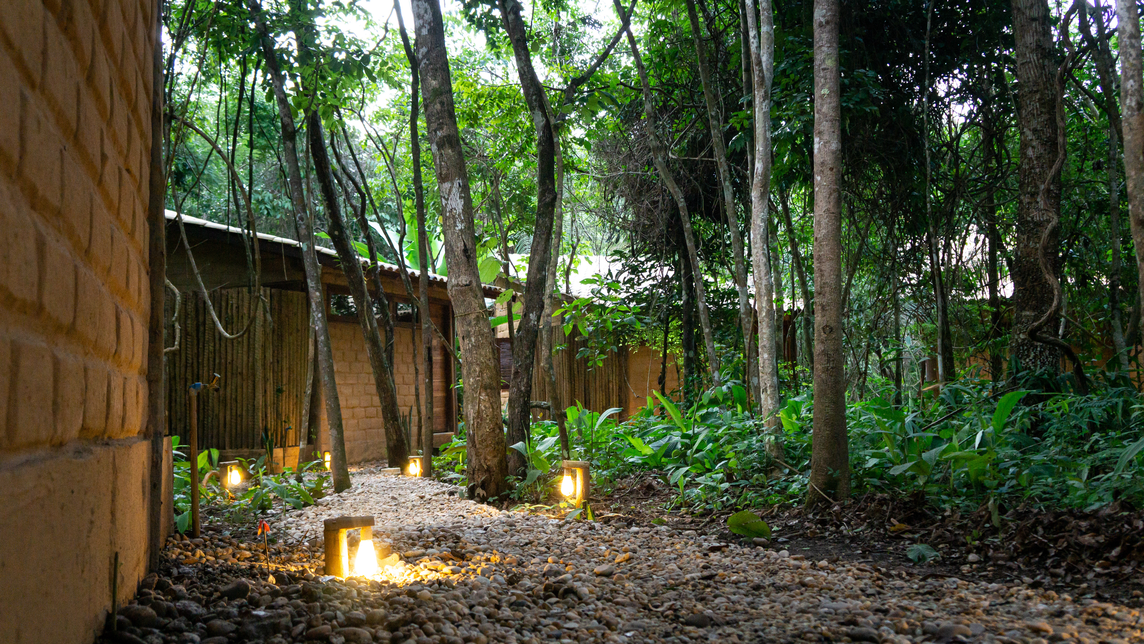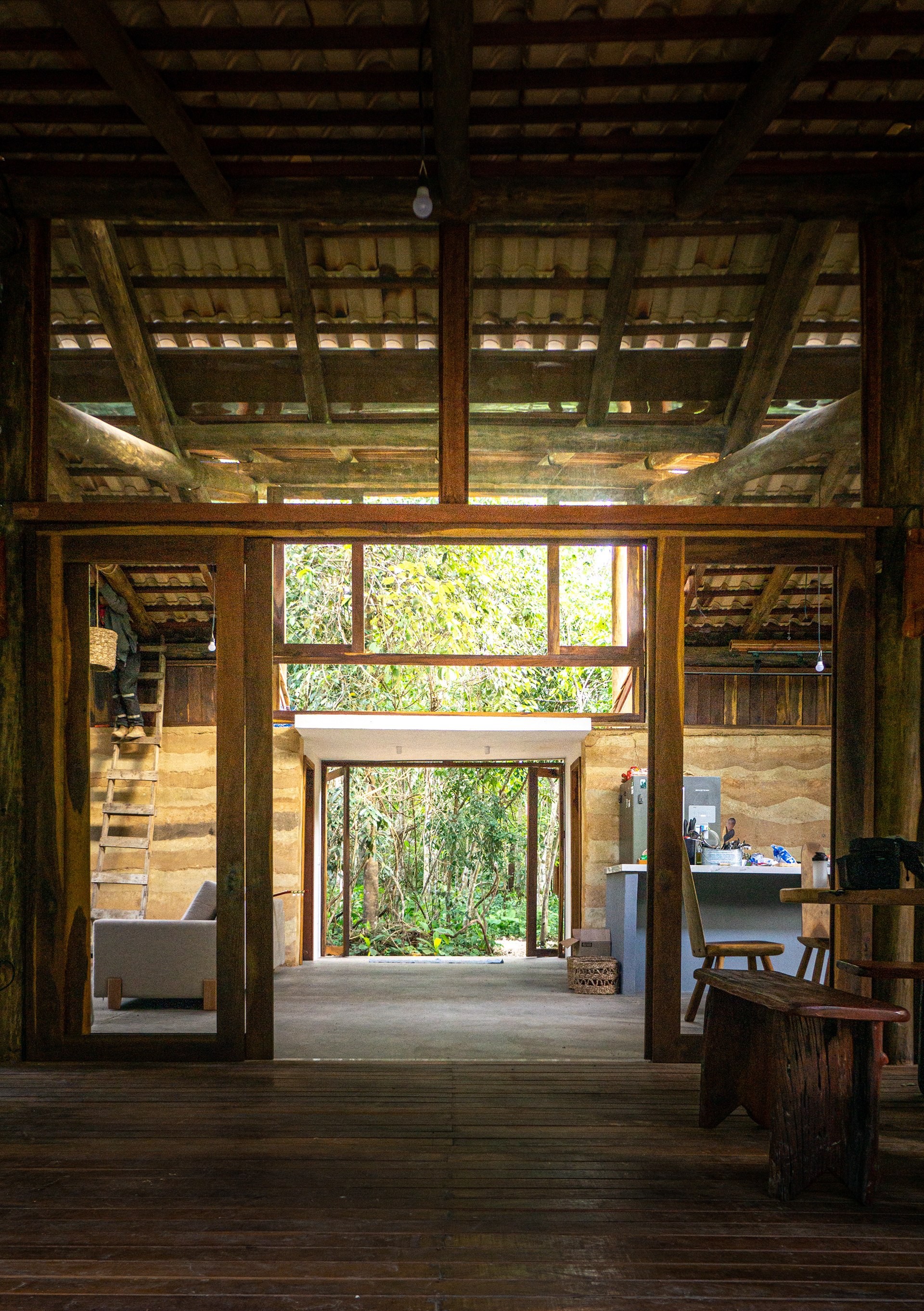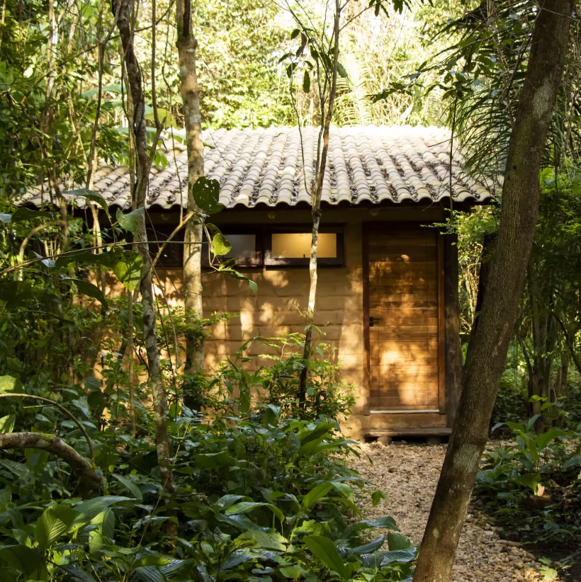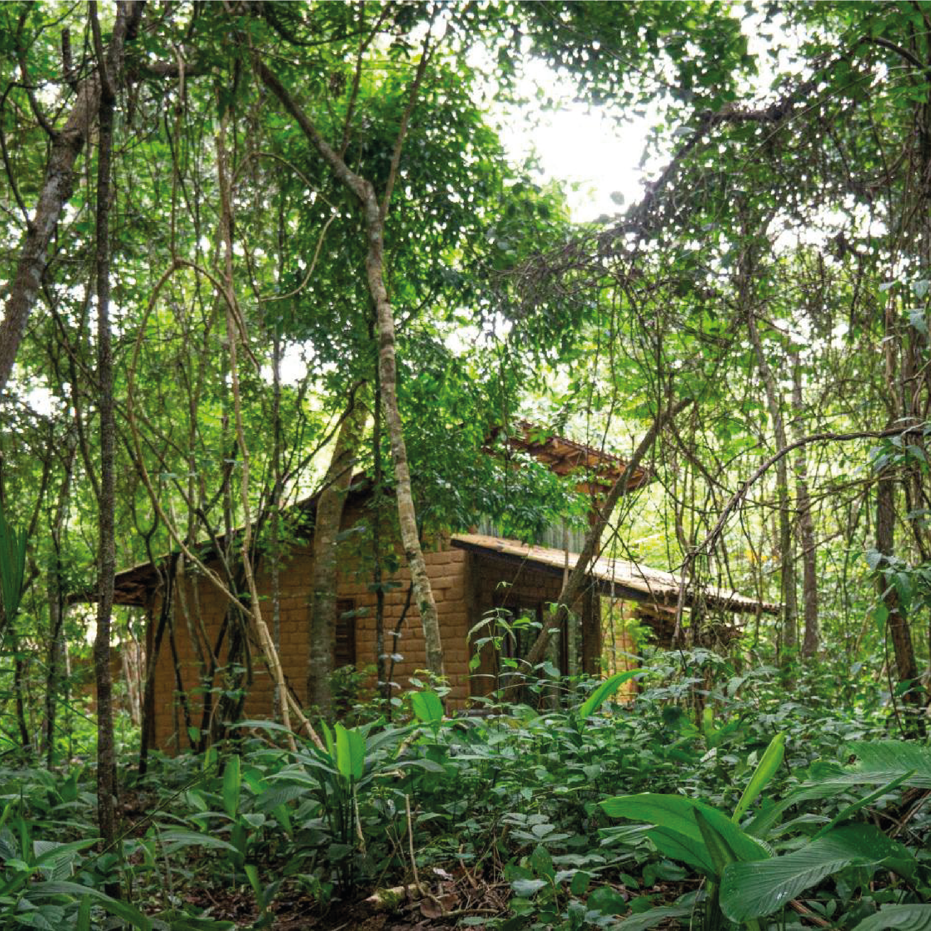 Private chalets are carefully positioned to frame forest views while minimizing environmental impact. Structures in treated eucalyptus and adobe walls made from local soil provide thermal comfort through material mass, cross ventilation, and passive strategies rooted in place. The collective building acts as the village’s heart, dissolving boundaries between interior and exterior through rammed-earth walls, generous openings, and strong connection to the surrounding forest. Ecological water systems and decentralized solar energy reinforce an integrated, low-impact approach where architecture, landscape, and daily life coexist as one system.