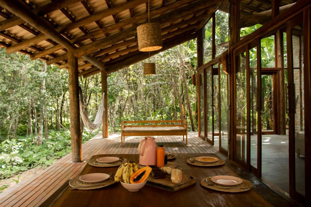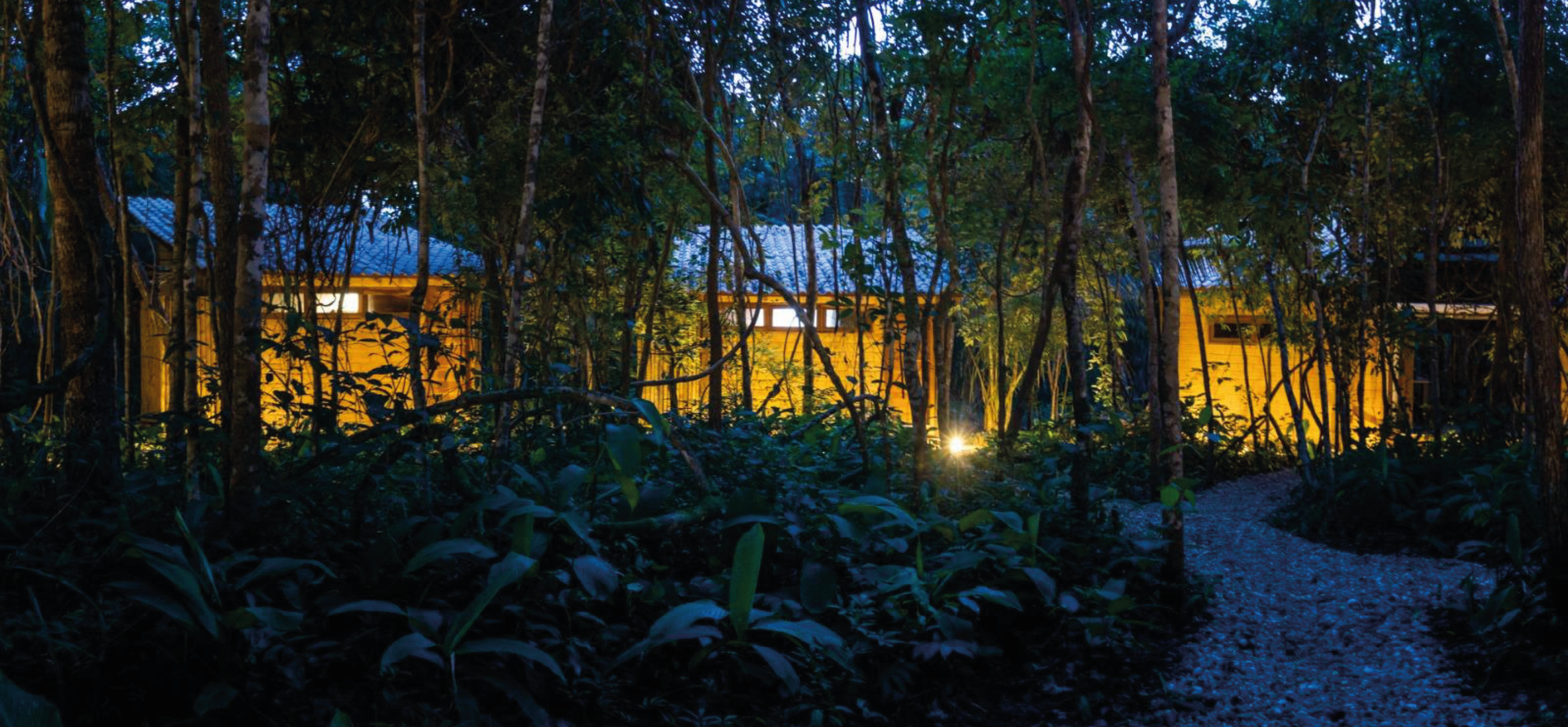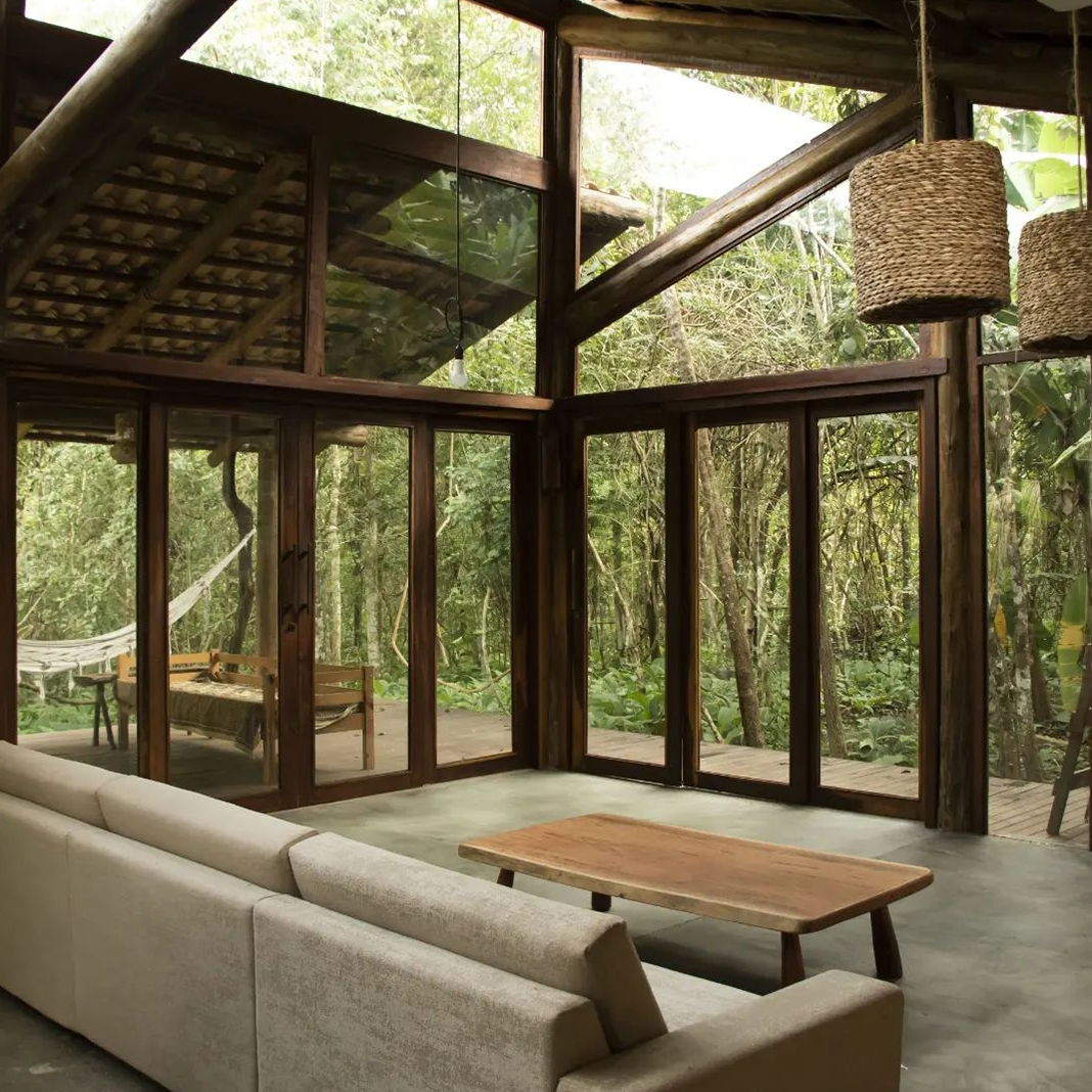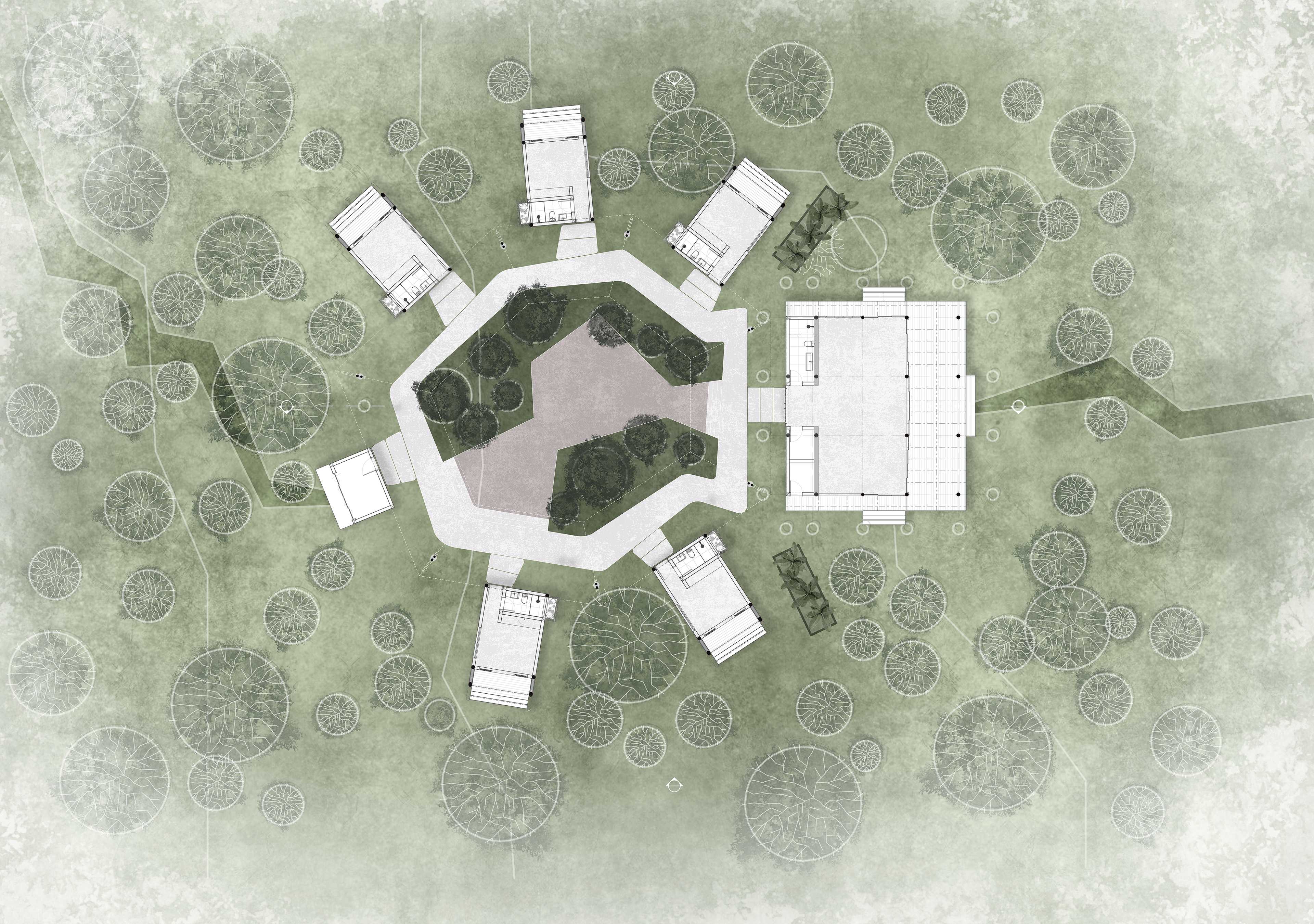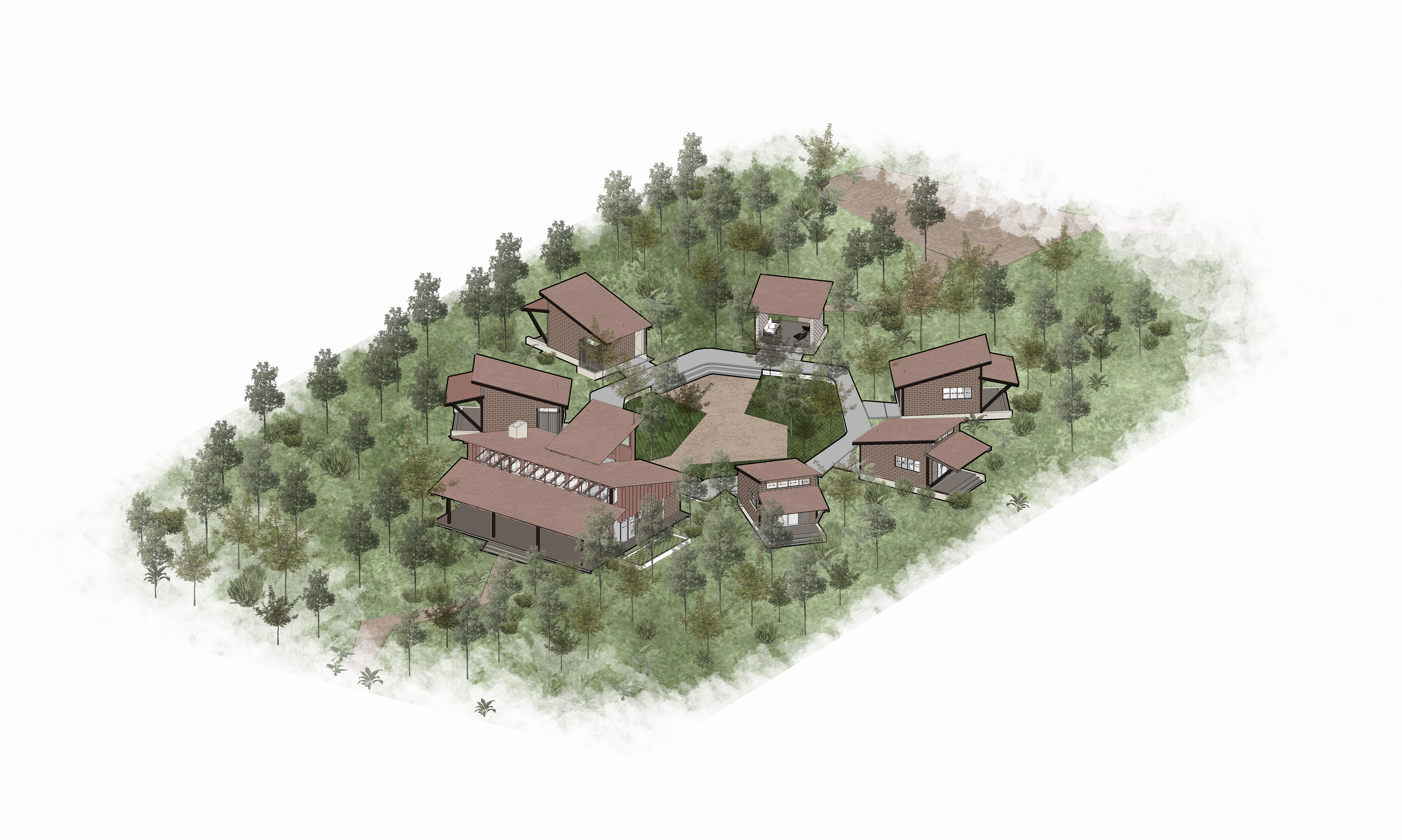 Private chalets are carefully positioned to frame forest views while minimizing environmental impact. Structures in treated eucalyptus and adobe walls made from local soil provide thermal comfort through material mass, cross ventilation, and passive strategies rooted in place. The collective building acts as the village’s heart, dissolving boundaries between interior and exterior through rammed-earth walls, generous openings, and strong connection to the surrounding forest. Ecological water systems and decentralized solar energy reinforce an integrated, low-impact approach where architecture, landscape, and daily life coexist as one system.